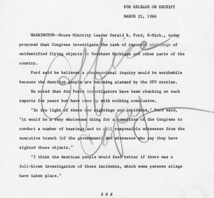 “In light of these new sightings and incidents,” Ford wrote, “it would be a very wholesome thing for a Committee of the congress to conduct a number of hearings and to call responsible witnesses from the executive branch (of the government) and witnesses who say they have seen these objects.”⁴⁰