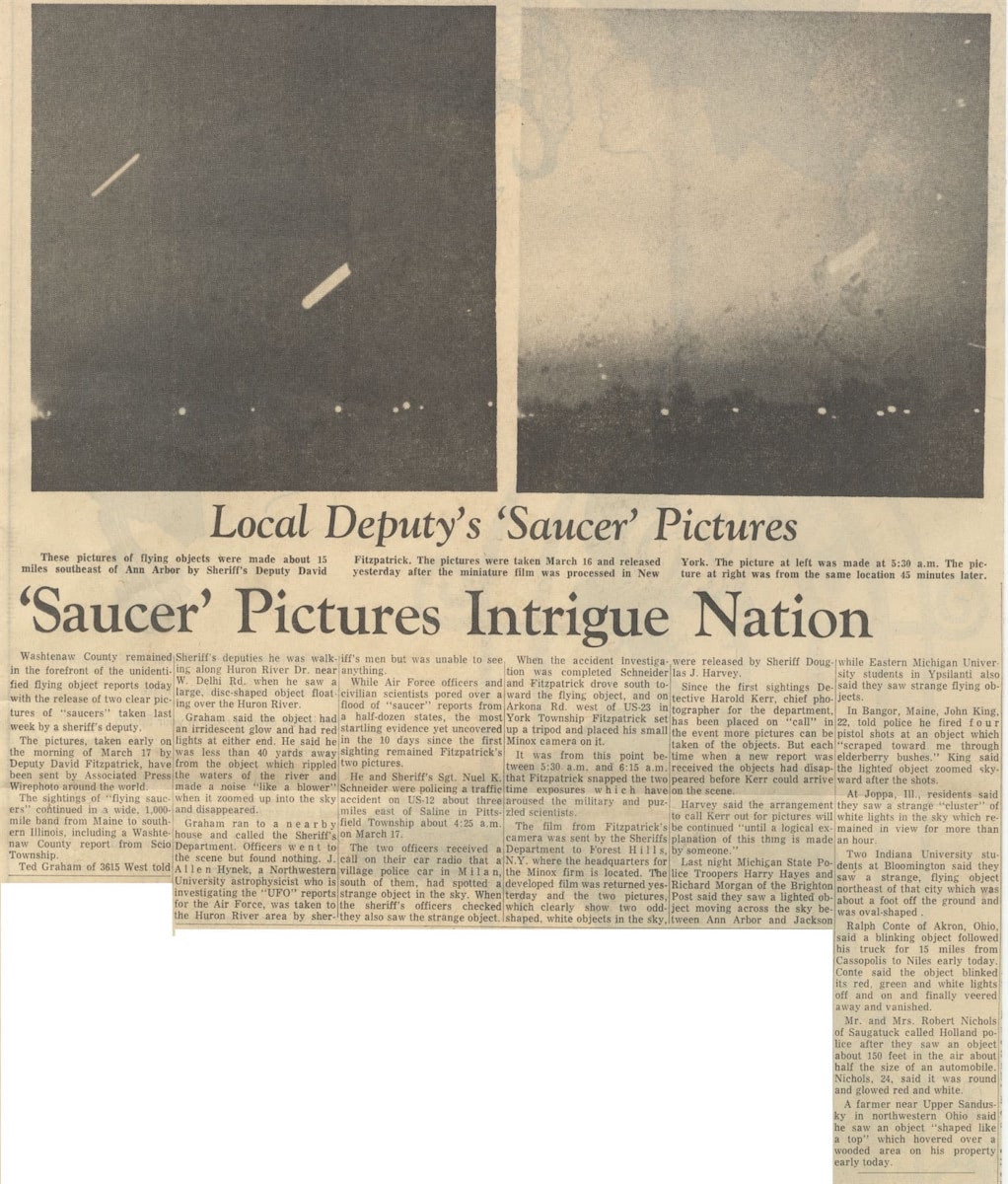 On March 17th, Milan, Michigan Sheriff Sergeant Nuel K. Schneider and Deputy David Fitzpatrick reported three or four “top-like” objects darting around the sky at 4:25 a.m. Fitzpatrick took pictures.⁷