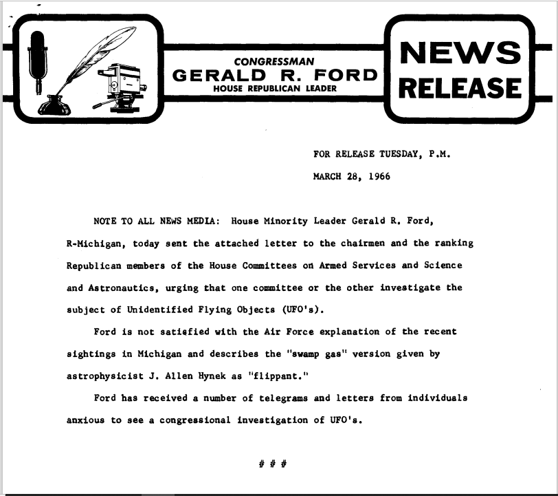 Equally dissatisfied with the swamp gas explanation, and having fielded a number of calls from frustrated constituents, House minority leader and future U.S. President Gerald R. Ford immediately issued a formal request for congressional hearings into the matter.