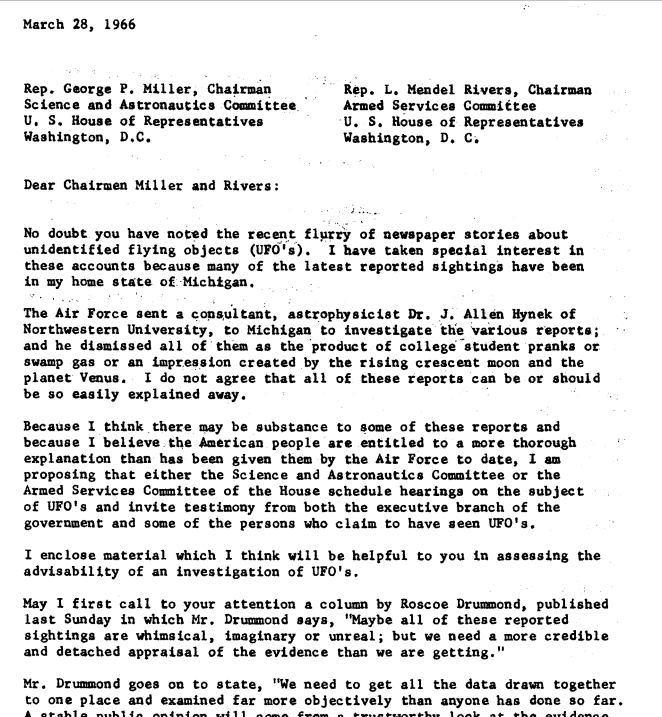 Ford also sent a letter to Representative George P. Miller, the Chair of the Science and Astronautics Committee, and Representative L. Mendel Rivers, the Chair of the Armed Services Committee, calling for hearings and refuting the swamp gas explanation.