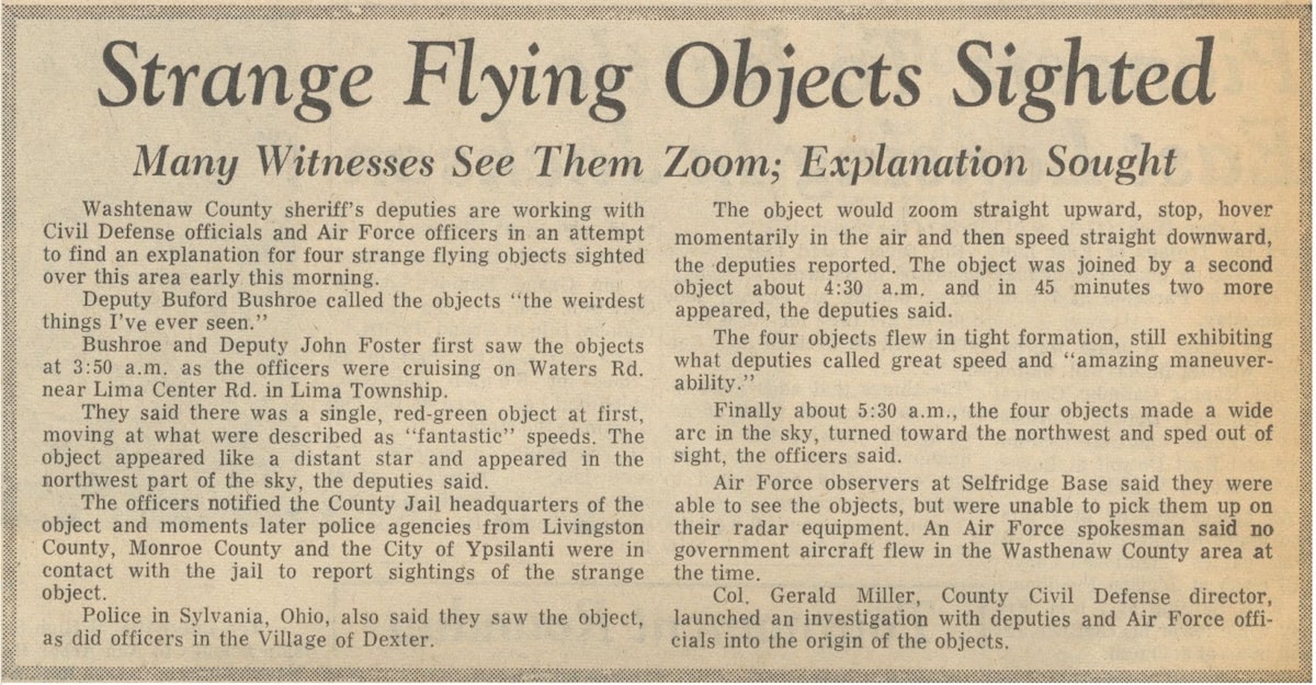 “The four objects flew in tight formation, still exhibiting what deputies called great speed and maneuverability,” the same newspaper explains. “Finally about 5:30 a.m., the four objects made a wide arc in the sky, turned toward the northwest, and sped out of sight, the officers” The same article indicates that the Air Force did not see the objects on radar, and also confirmed no government aircraft were in the Washtenaw area at the time.⁶