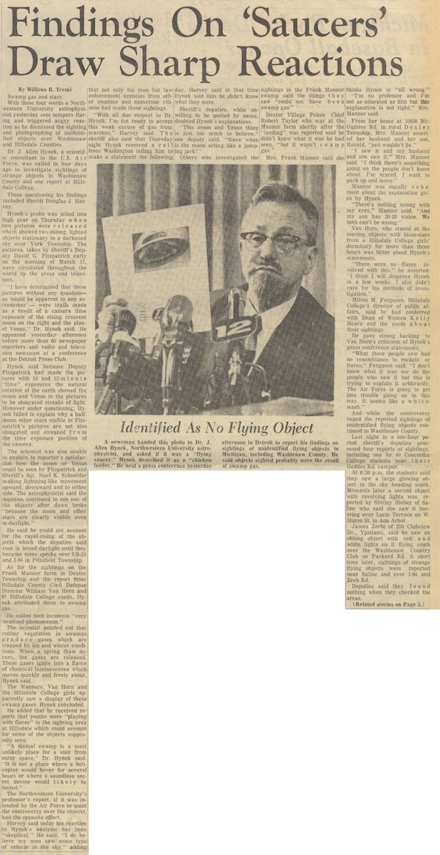 Hynek conducted an investigation of the Mannor Farm and the Hillsdale College locations, including speaking with civilian witnesses and police officers involved in the incidents. On March 25th, Hynek called a press conference at the Detroit Press Club which was attended by over 60 members of the media to explain the sightings. His conclusion? Nearly all of the witnesses, in particular those from the Mannor Farm and Hillsdale College, had seen nothing more than a crescent moon, Venus, and common swamp gas.²⁶